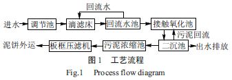 经过滴滤床处理后,COD 已降解50%左右,只是作为一个低耗的一级处理,而接触氧化做为浸没式生物膜,也具有抗冲击负荷、没有污泥膨胀等优点,采用该技术配合滴滤床使用,能够最大程度减少池容,且操作管理极为简单。
